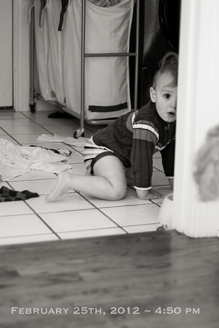 Don't look so surprised, Harry. Of course I found you. When you aren't hanging on my leg I know that you are in one of four places. 1) Crying at the backdoor because you want to go outside and play. 2) Playing in the toilet. 3) In my bathroom relieving all of my bathrooms drawers of their contents. or, 4) In the laundry room, eating Charley Dog's food and splashing in his water bowl. You aren't very mysterious, silly baby.
