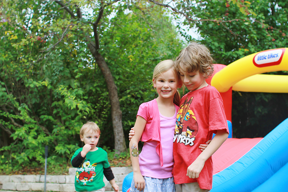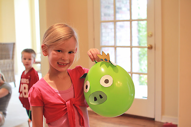 I ensured that all of Lucas's friends parents would love me by sending them all home with sling shots. But every kid needs a sling shot, right? We used them for a game where the kids tried to knock down the piggies with a little rubbery bird and their new sling shot. Seriously. A big hit.This game was a lot harder than it looked! But Laura was tenacious. She wouldn't give up until she had knocked down all three piggies. She did it. Because she's War-wah. And she rocks a sling shot.